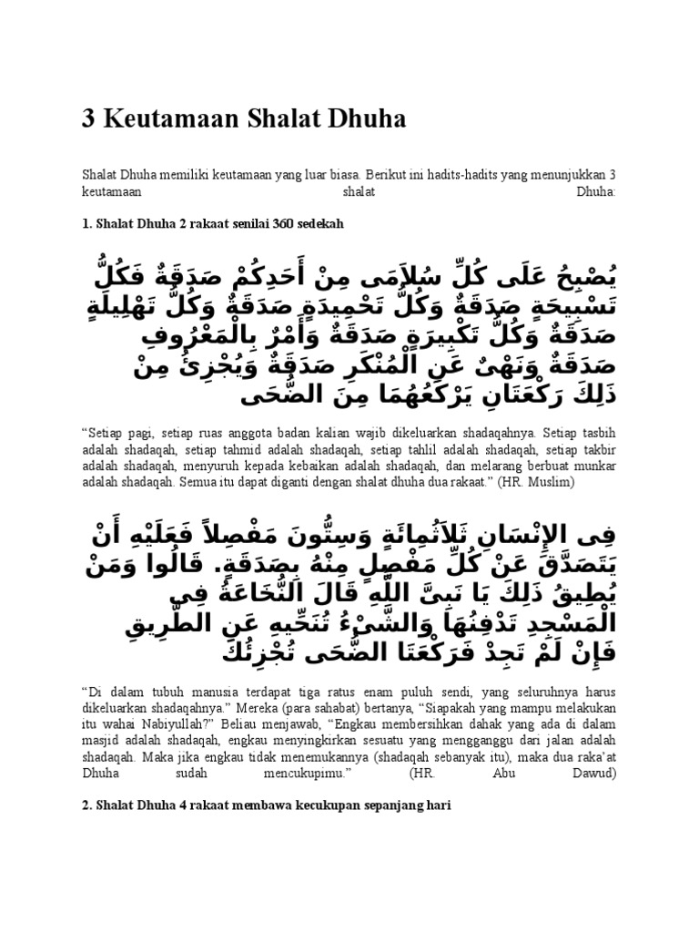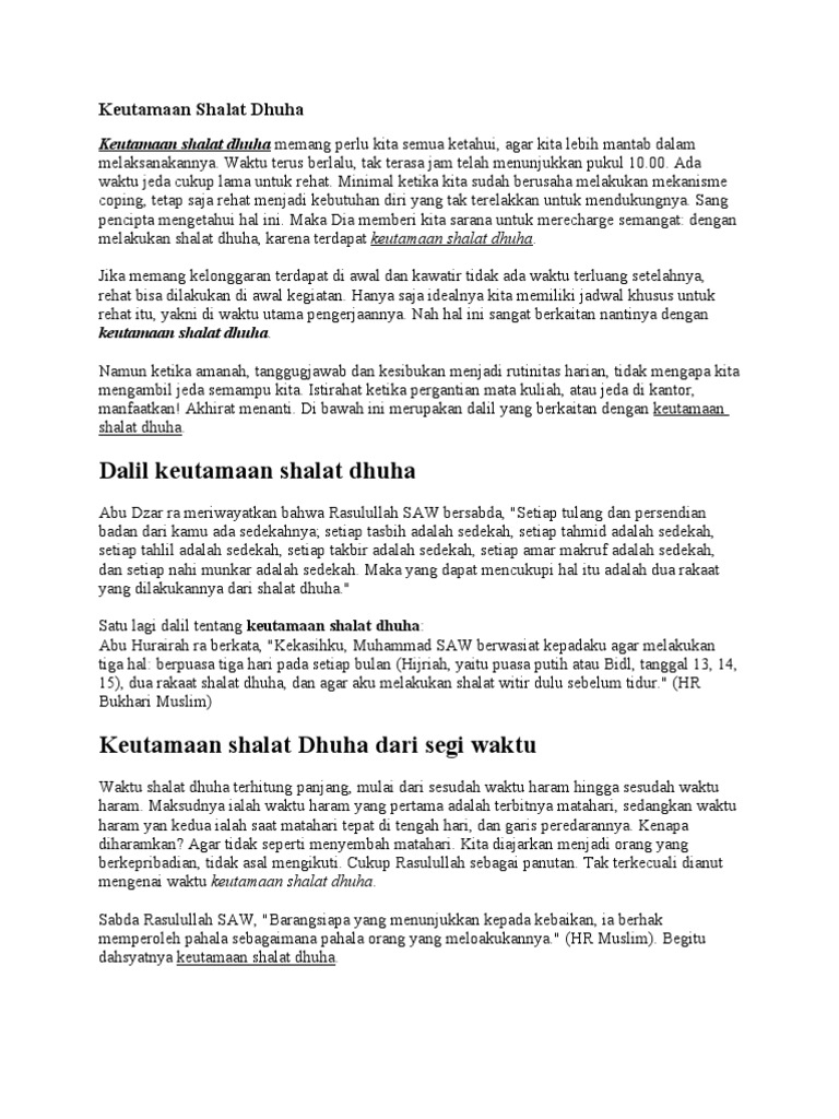 Hikmah keajaiban keutamaan sholat dhuha sholat dhuha merupakan sholat sunnah muakkad yang dianjurkan rasulullah saw dimana shalat dhuha dilakukan setelah terbit matahari hingga menjelang masuk waktu dzuhursholat dhuha adalah sholat sunnah yang memiliki keistimewaan dan keutamaan yang banyak sekali dan manfaat baik dari pahala amalan shalat dhuha dan juga dari aspek segi kesehatan. Demikian 6 keutamaan shalat dhuha semoga semakin memotivasi kita dalam mengamalkan sunnah nabi ini serta menjadikan sholat dhuha sebagai salah satu kebiasaan rutin.