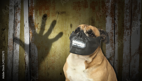 Bulldog Wearing A Skull Mask In Front Of A Scary Backdrop