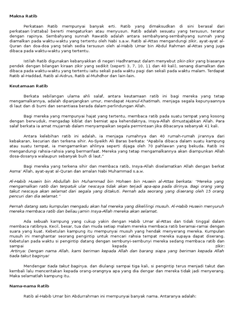Keutamaan ratib al haddad. Didalam khazanah kaum muslimin dikenal ratib al aydrus ratib al haddad ratib al athas dan ada kemungkinan akan bertambah sesuai dengan perkembangan zamannya. Tetapi mereka lebih terkenal di sana dengan tariqah al attasiyah keutamaan ratib al athtas berkata sebagian ulama ahli salaf diantara keutamaan ratib ini bagi mereka yang tetap mengamalkannya adalah dipanjangkan umur mendapat husnul khatimah menjaga segala kepunyaannya di laut dan di bumi dan senantiasa berada dalam perlindungan allah. Keutamaan ratib al haddad makna ratib perkataan ratib mempunyai banyak arti ratib yang dimaksud disini berasal dari perkataan rtb yang artinya mengatur atau menyusun.