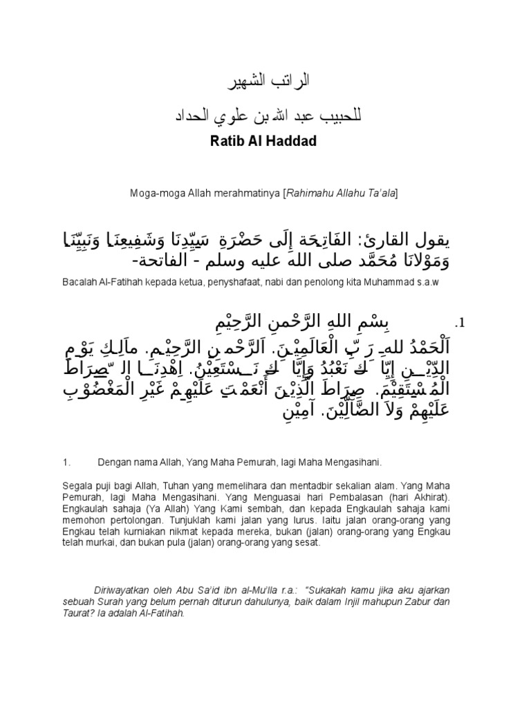 Lslam aalykm orhm allh obrkath slo aal alnby mhmd. Lafadzteks dzikir dan wirid ratibul haddad full karya al imam habib abdullah bin alwi al haddad beserta terjemahan indonesianya. Ratib yang bergelar al ratib al syahir ratib yang termasyhur ini disusun berdasarkan inspirasi pada malam lailatul qadar 27 ramadhan 1071 hijriyah.